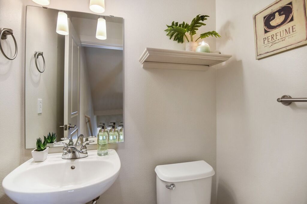 Enter at ground level beside your tandem garage (or step in through the door from the garage itself), set your shoes in the tiled foyer, hang your jacket in the closet, and head up the carpeted staircase. You'll find a half bath with a pedestal sink conveniently located at the top of the stairs. This is perfect for anyone dropping by for a visit.