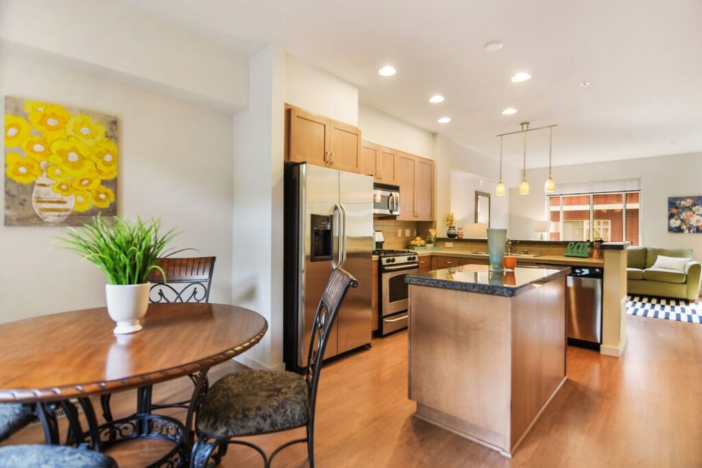 In the kitchen, bring linens and decor of any color to compliment the stainless appliances. Cook on the gas stove, while friends or family pull a stool up to the bar counter lit by a triple pendant light fixture.