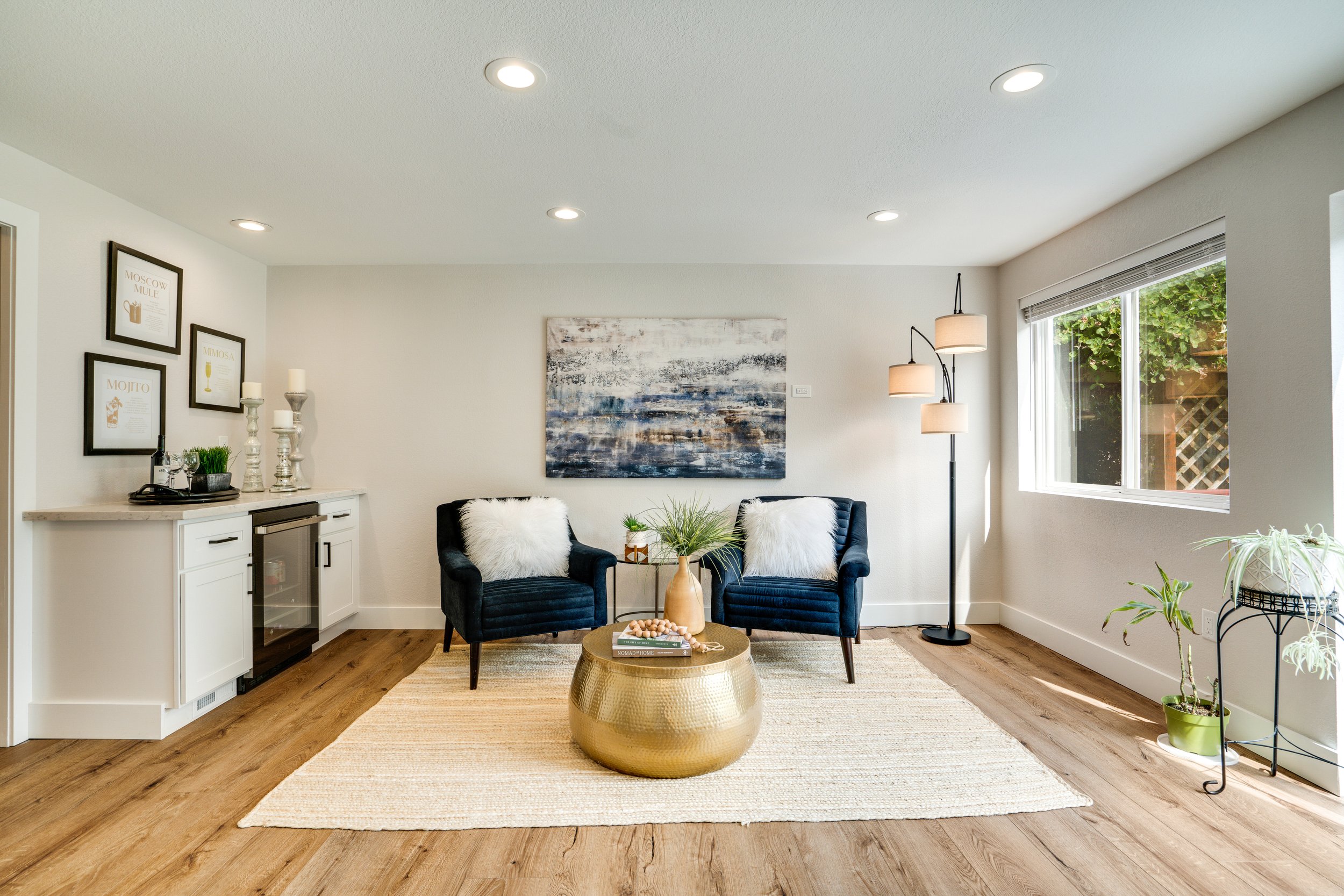 A lounge area perfect for another dining spot or a cozy family room adjoins the kitchen with sliding glass doors that open to the deck and fenced back yard. The kitchen renovation included the addition of this coffee/beverage bar with matching quartz countertop and cabinetry and the beverage cooler with a soft-close door and special settings for a variety of beverages.