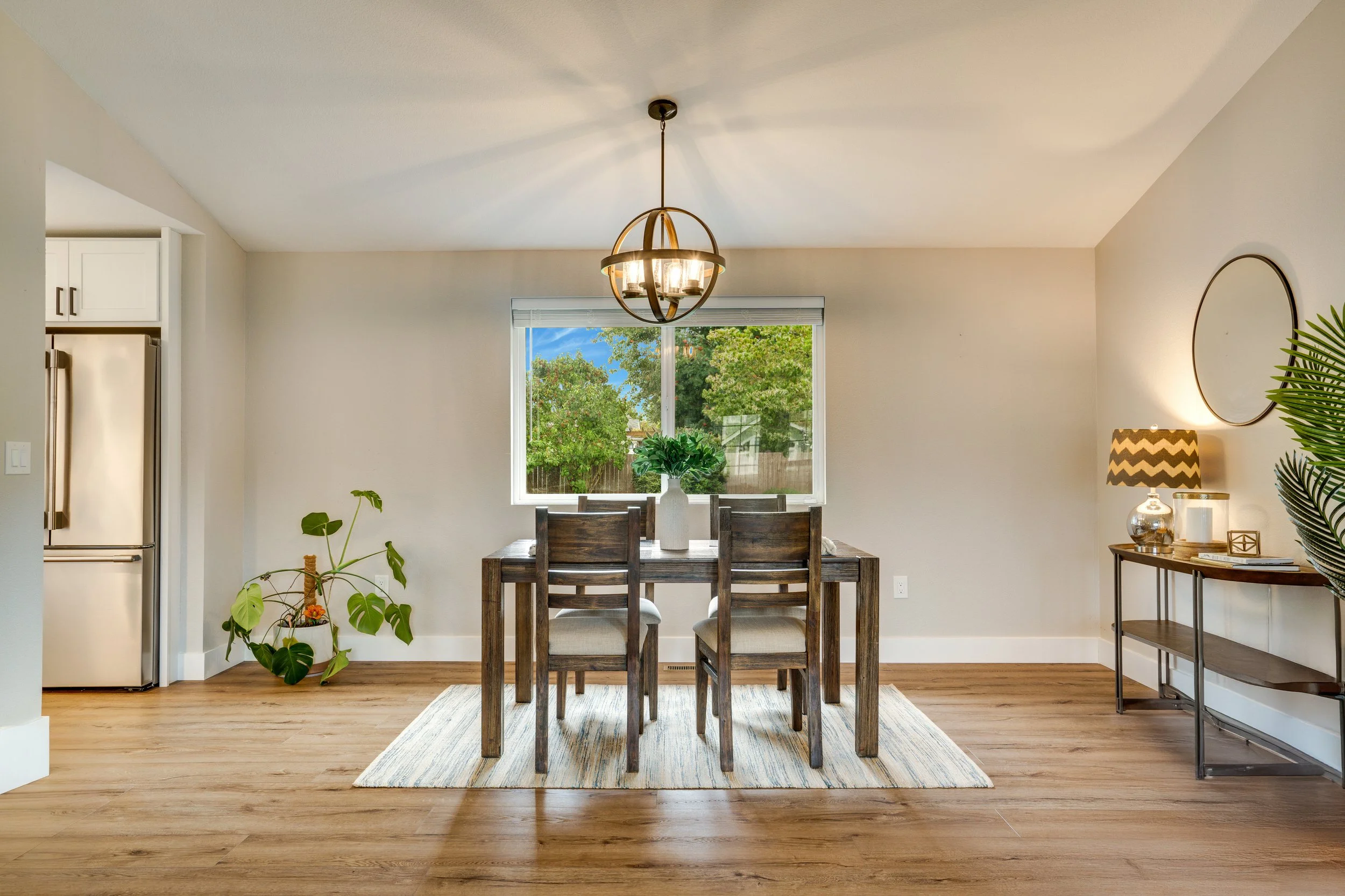 Set up a dining area by the window overlooking the back yard. With new lighting, new blinds, new flooring, and fresh paint, there's nothing left to do but sit and enjoy a meal.