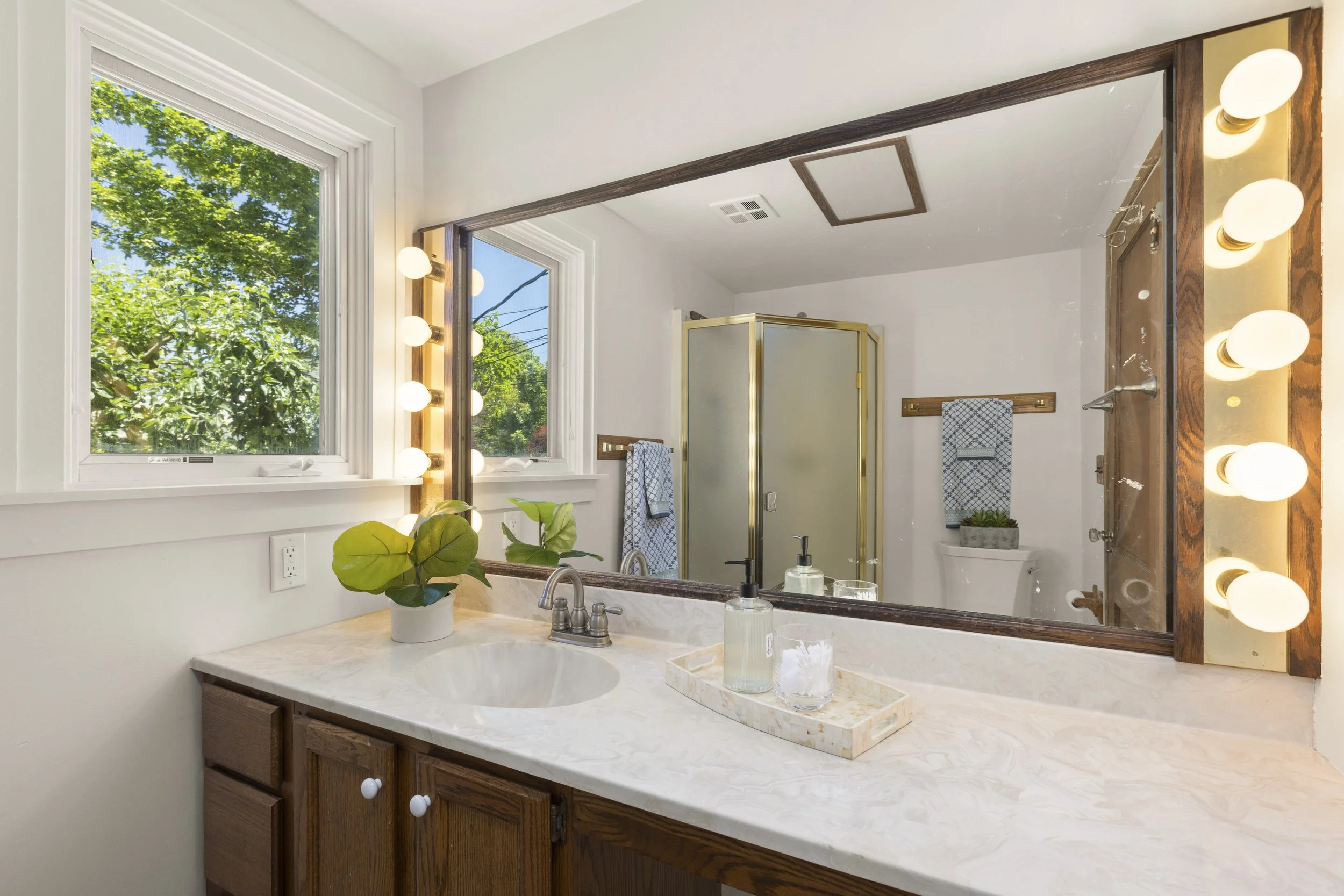 The 3/4 bath is located between the kitchen and the main floor bedroom. A window opens to the back yard and you can see the shower stall reflected in the mirror above. Bathrooms are in working order, but ready for updates to your taste. A built-in linen closet offers storage just outside in the hall.