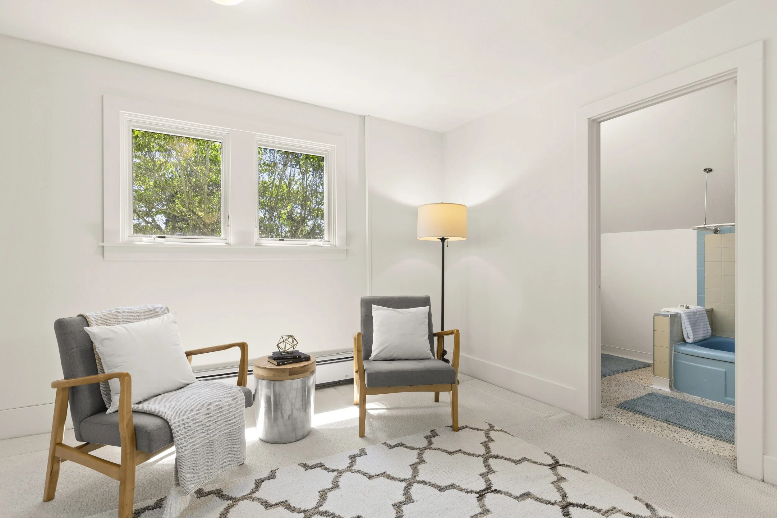 Take the stairs up from the living room. A built-in storage cupboard and a skylight greet you at the top of the stairs. The door just to the right of the cupboard opens to storage space under the eaves. A large, bright landing space is lit by overhead light and windows facing south. This is a space for an additional sitting room, exercise spot, or maybe a play area. With the bathroom at one end, and the front bedroom at the other, it could also be reimagined/reconfigured to create a primary suite. The landing includes a large closet, a most welcome feature. This home offers plenty of good storage from built-ins to extra closets, to open areas in the basement, and the detached garage.