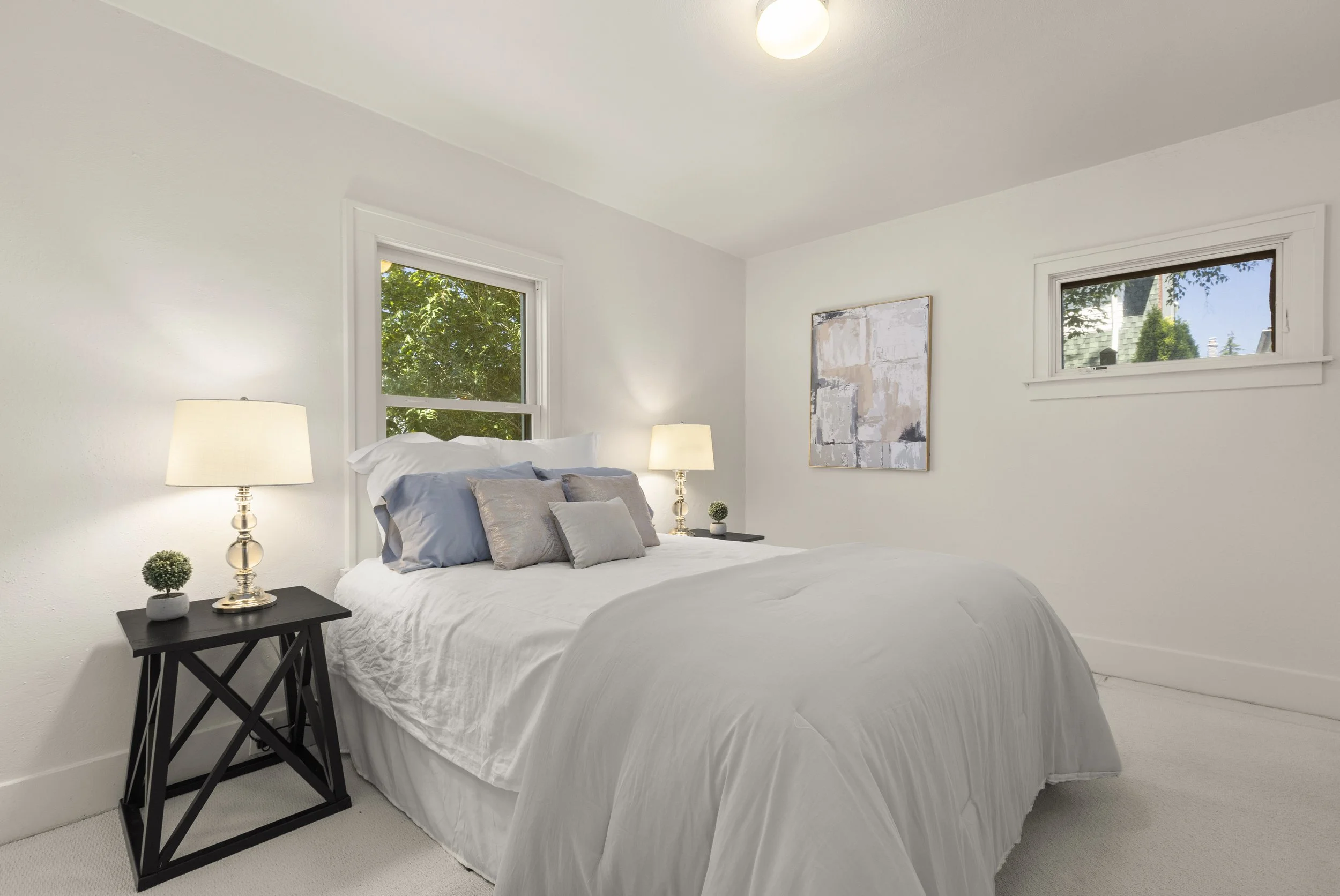 The first of two upstairs bedrooms is right at the top of the stairs. Windows face north in this freshly painted bedroom with views over the gardens, trees, and rooftops of the neighborhood. (For a water view, walk up the block and you’ll see Puget Sound in two directions.) Slide the closet open in each bedroom to reveal hardwood floors in the closet space.