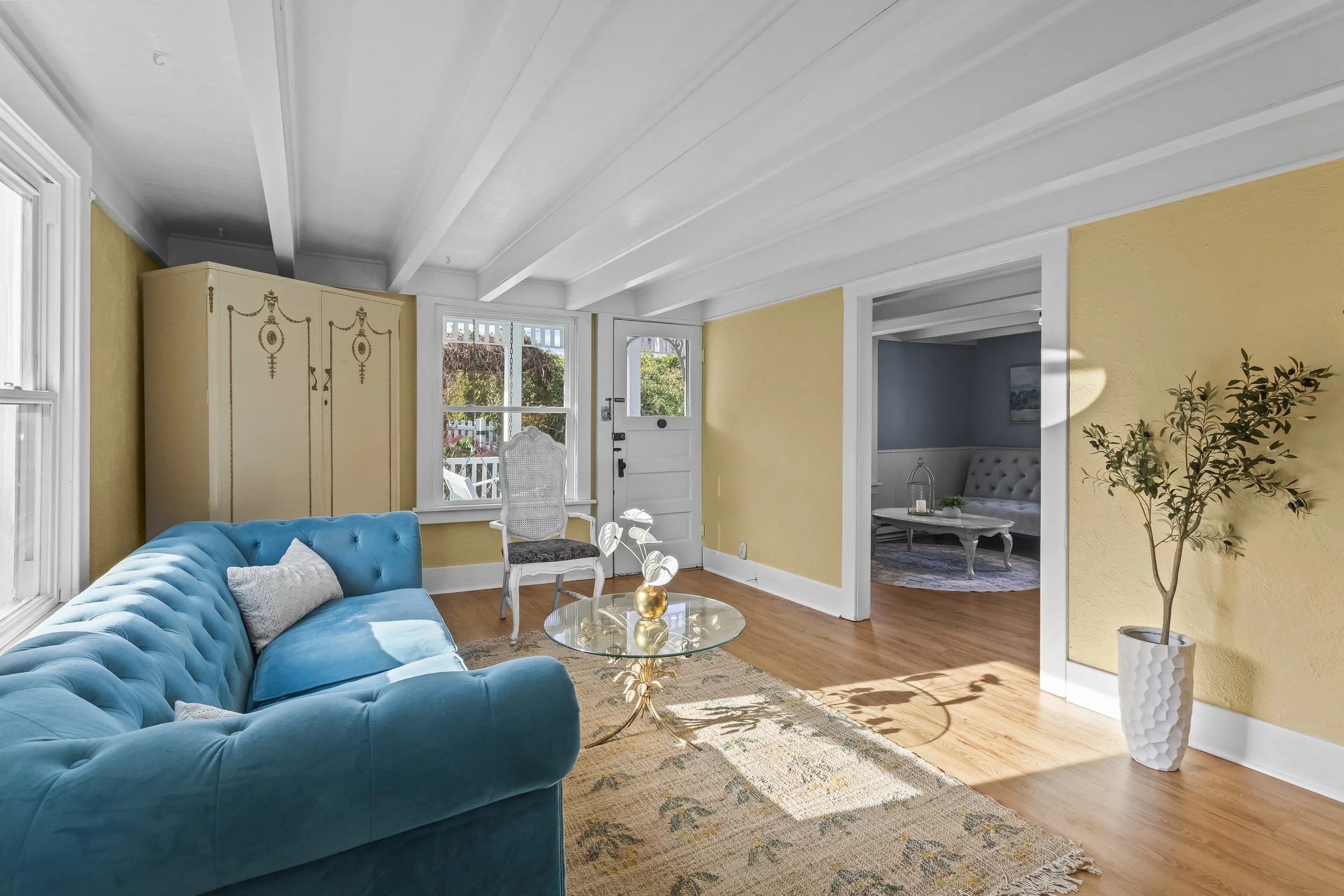Open the gate beneath the arbor to enter a garden where hydrangeas and roses bloom beside the covered front porch, then come inside to get acquainted with this 1905 home with beamed ceilings, a 1/2 bath for guests, and two flexible front rooms in addition to the dining room and living room. Upstairs, find fir floors, two quaint bedrooms, glimpses of the water, and a 2nd bath.