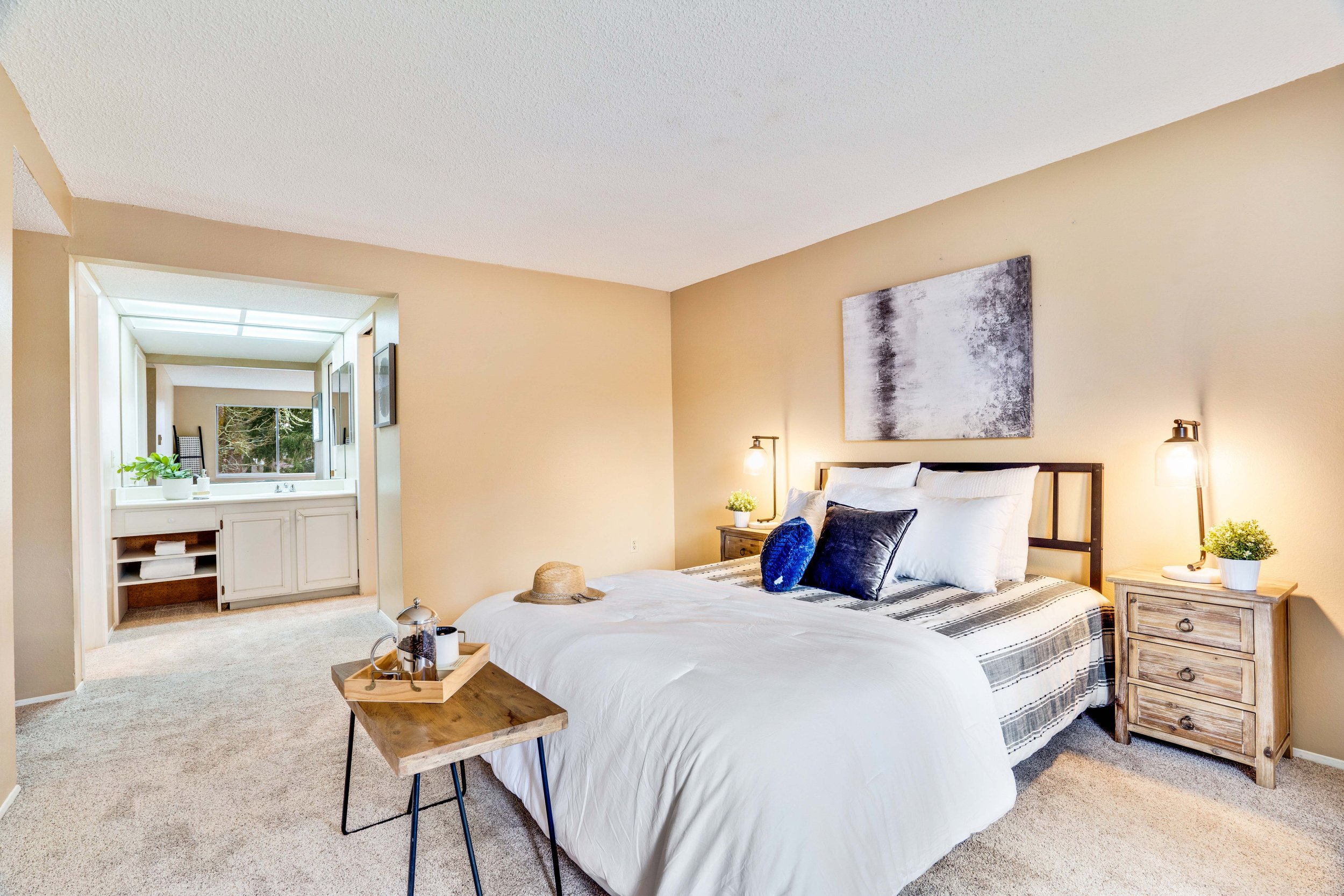 The primary suite includes a private 3/4 bath and a walk-in closet. Find a new shower and new laminate flooring in the bathroom with the sink and vanity right outside the shower room for added flexibility. The spacious bedroom includes the updated Mohawk SmartStrand carpet found throughout the home.
