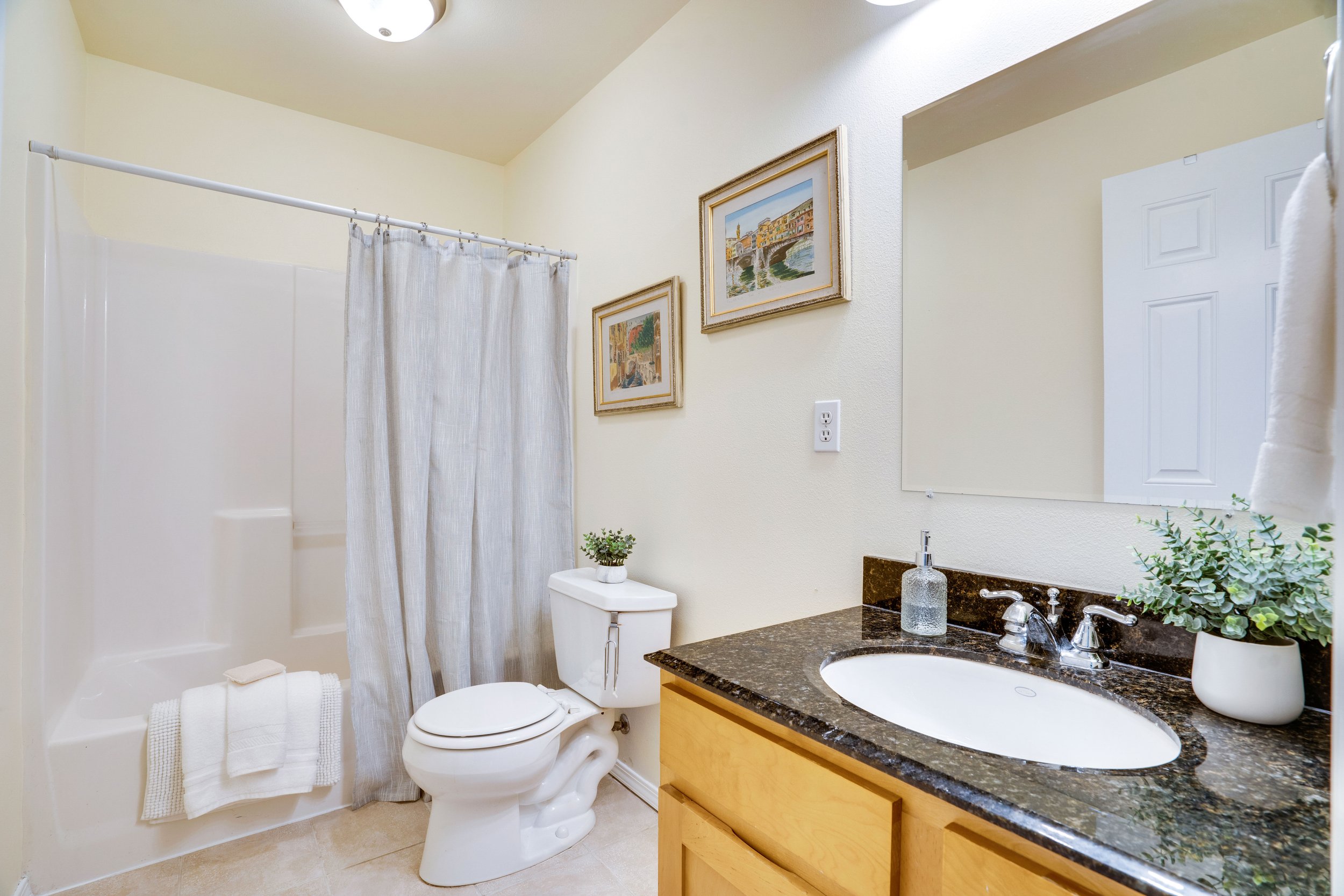 You’ll find the third full bath at the foot of the stairs, just outside the lower living room. Like the other two bathrooms, this one features tile floors, storage in the vanity, and an easy-to-clean tub surround.