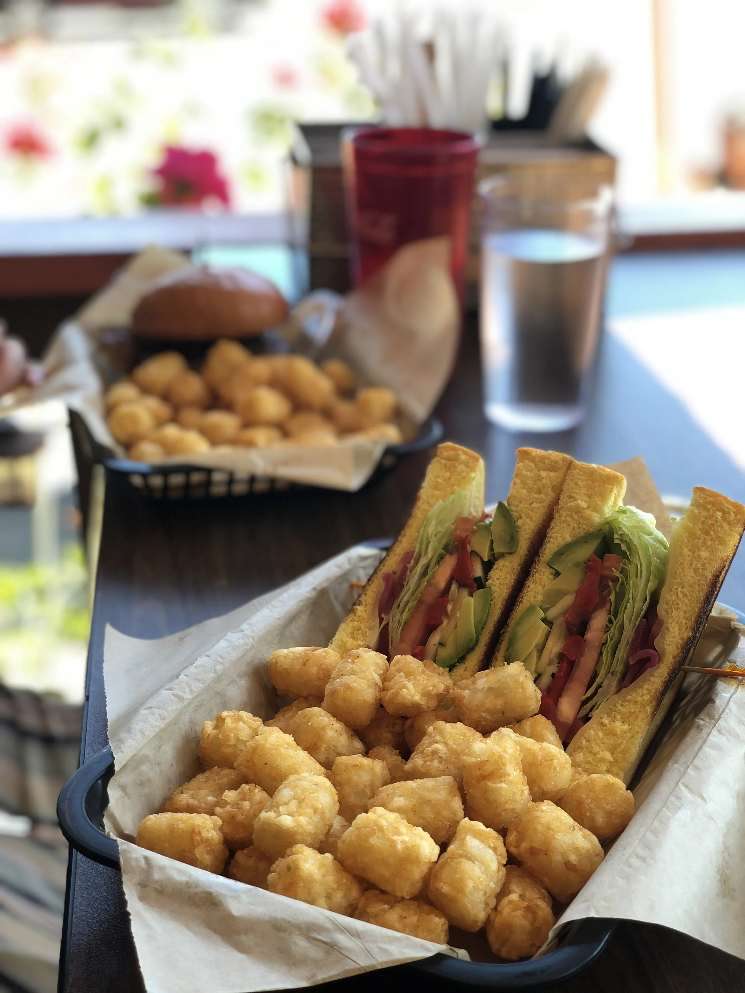 Find a seat inside or out and Dusty’s Hideway, then order tots and a veggie sandwich, or onion rings and adult slushies.