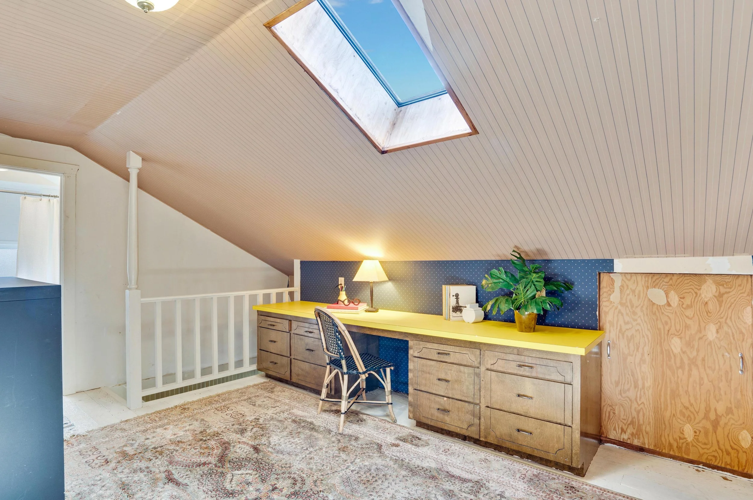 Think of this second floor as a potential private suite, with lounge space in the center, a bedroom to the north, and a bathroom to the south. Stairs lead up from the kitchen to this suite of rooms that greatly extend the living space below. A carpeted third bedroom is brightened by a skylight and window overlooking the front yard.