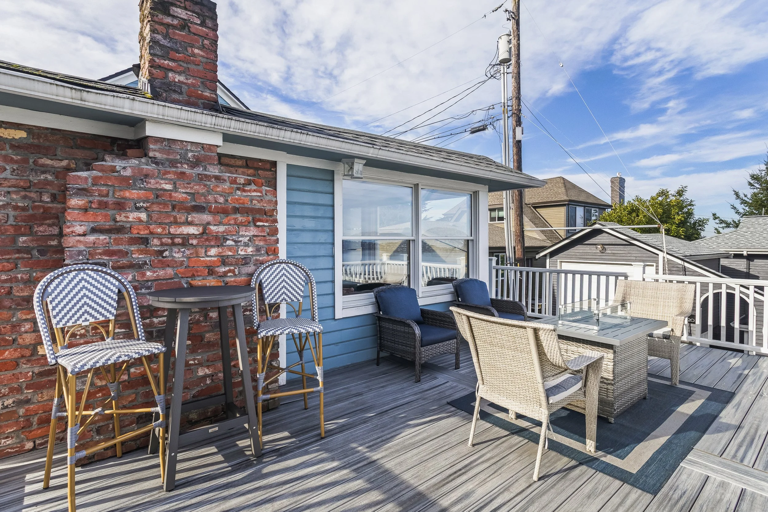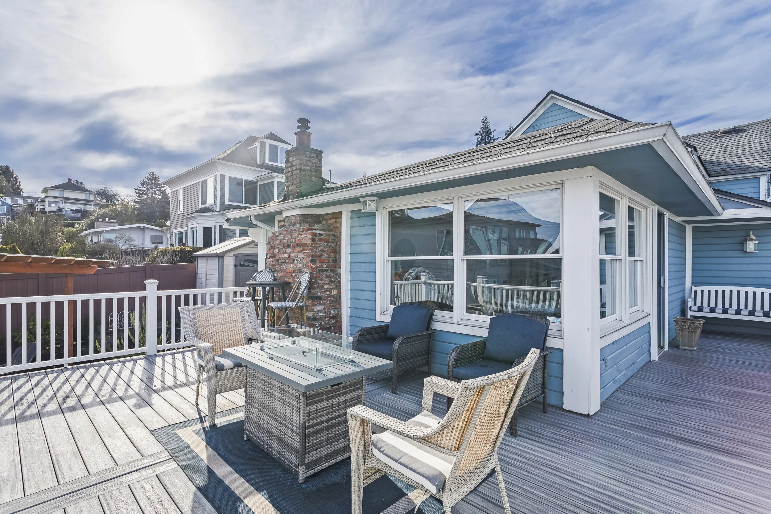 The deck is the summer living room. It’s the summer dining room too. The living room windows give the view and the door opens straight out to this fully enclosed deck where the view opens even wider. The homeowners loved being out here so much they had the deck rebuilt and expanded, an investment that allows more space for friends to sit for a meal, more space for pets to scamper, more space for deck furniture, for pots of flowers and basil and tomatoes and nasturtiums and geraniums—for anything and anyone you might like to join you in the open air over Commencement Bay.