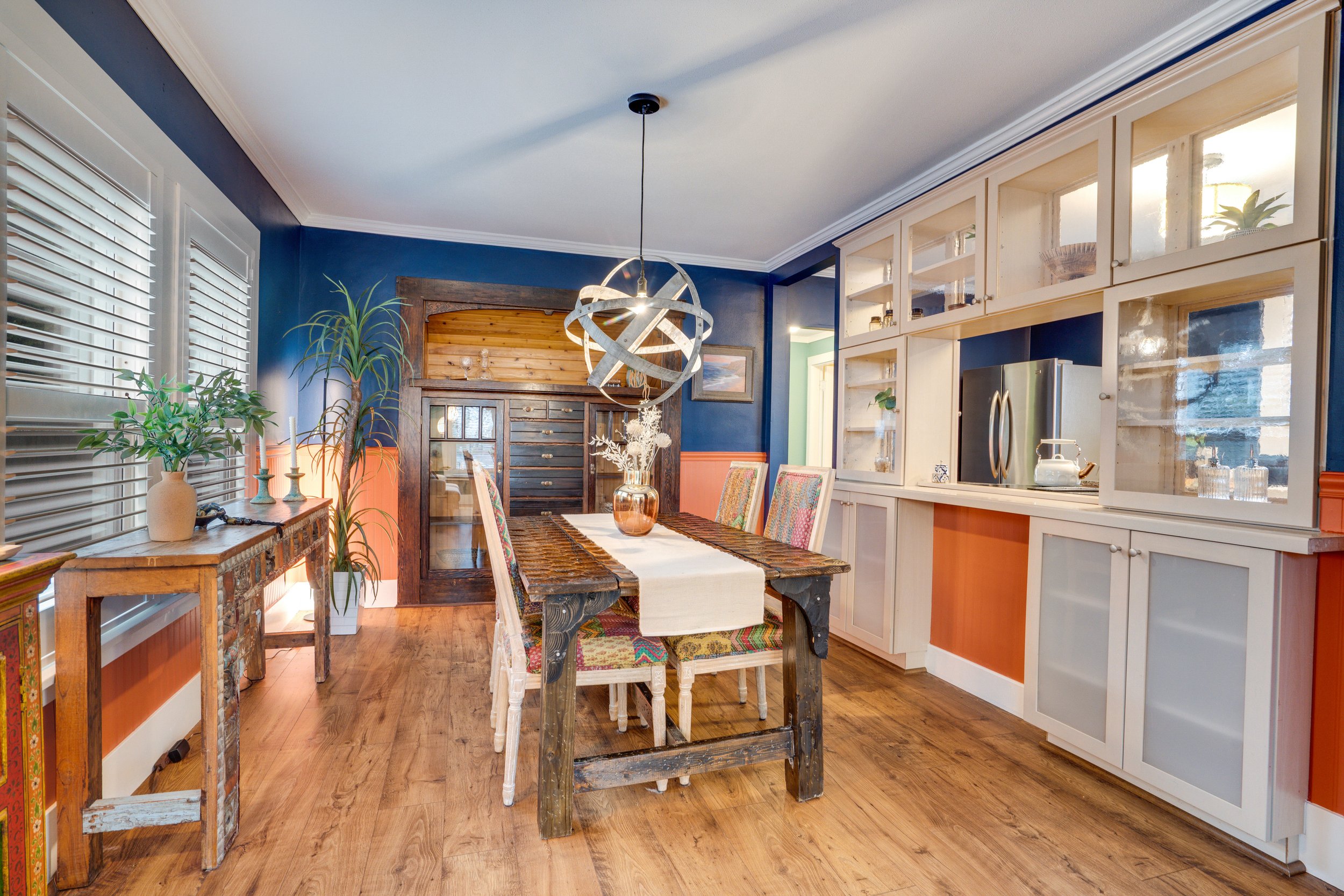 “The original built-in storage in the dining room is both beautiful and practical,” says the homeowner. Perhaps your heirlooms, treasures, favorite dishes, and linens will take their turn on these shelves and tucked away inside the drawers.