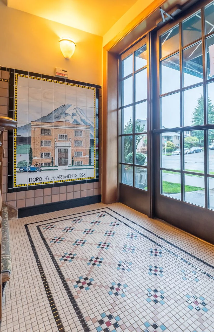 Found on the 1st floor of the The Dorothy (honored to be on the Tacoma Register of Historic Places), this tiny home provides ease surprising for its size. From the complete kitchen, to the full bath, numerous closets, and stacked washer/dryer, this well-appointed studio has it all. Finished with oak floors, honeycomb tile, coved ceilings, and original unpainted woodwork, the rooms are classically stylish.