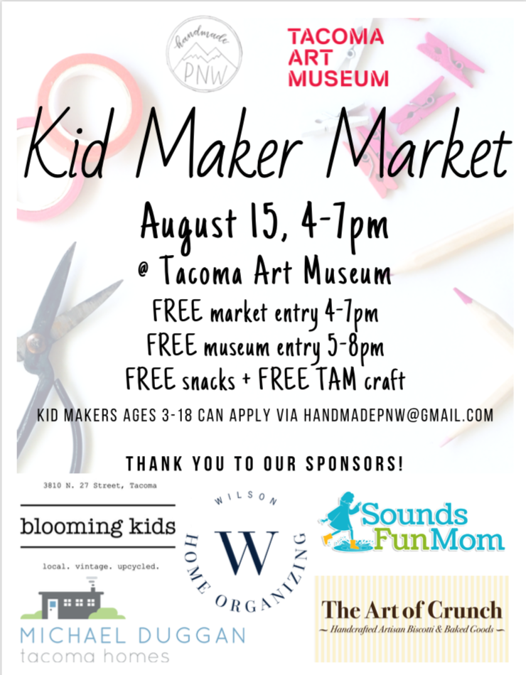 Kid Maker Market is in the TAM lobby where you’ll find over 20 artists and makers ages 3-18, plus free snacks and free kid craft AND a raffle to raise money for TAM’s Summer Camp Scholarship Fund
