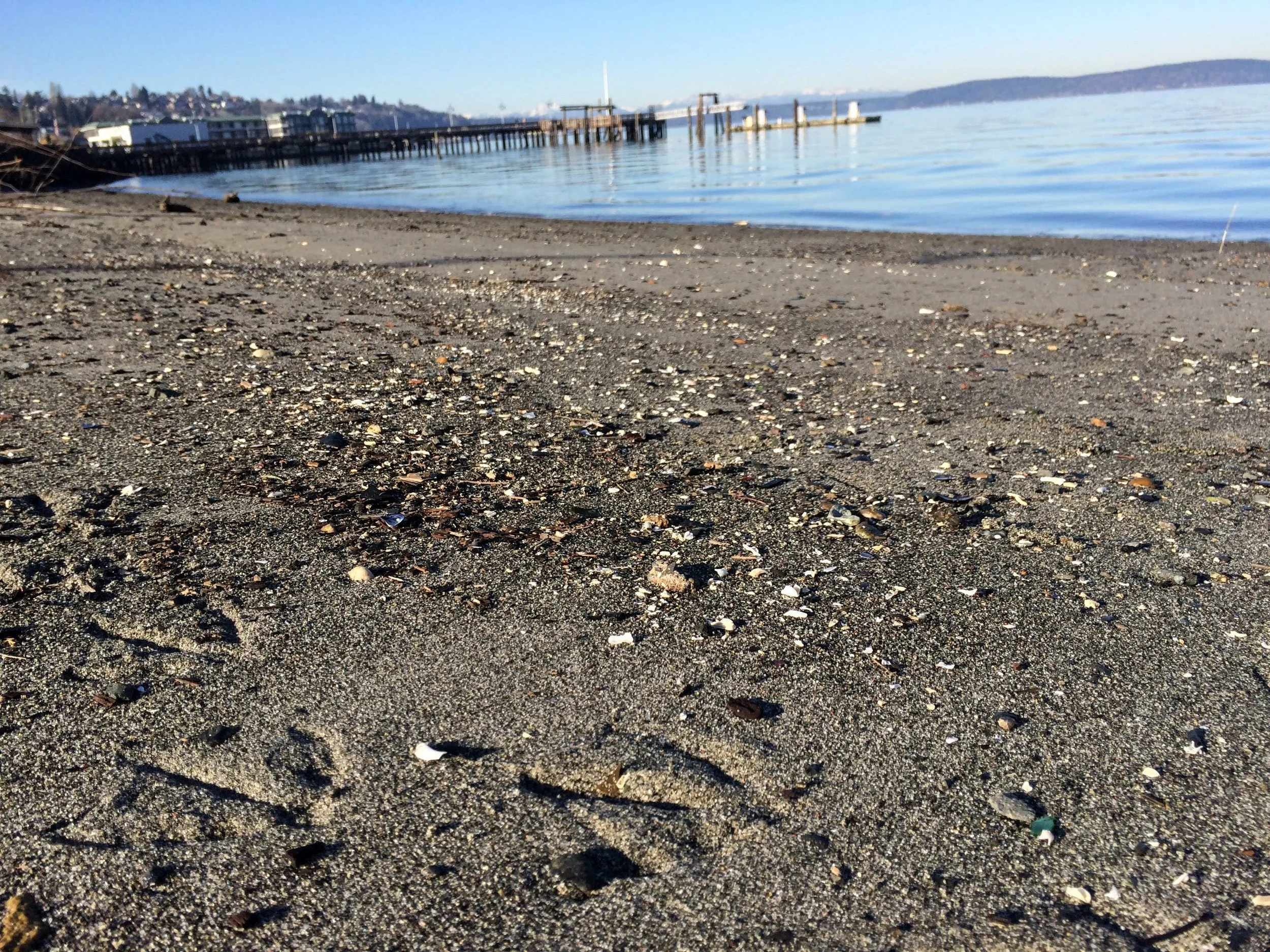 This beach is just tiny little stretch of sand, a short curve of shore on the Ruston Way Waterfront, but it is dear to me. Settled between the Old Town Dock and the sundial in Jack Hyde Park, this minute beach sits well below the road protected by a substantial boulder bulkhead, and there’s a public bathroom on the sidewalk at the end of the dock nearby. When I lived in a basement studio apartment across the street from Lowell Elementary, I often left the dim snugness of my one room to see the light and find out what the weather was doing. 15 minutes on my feet took me from my door to this beach where I could sit with my journal on my knee, follow bird tracks in the sand, and toss not-quite-smooth beach glass further out into the waves for tumbling.