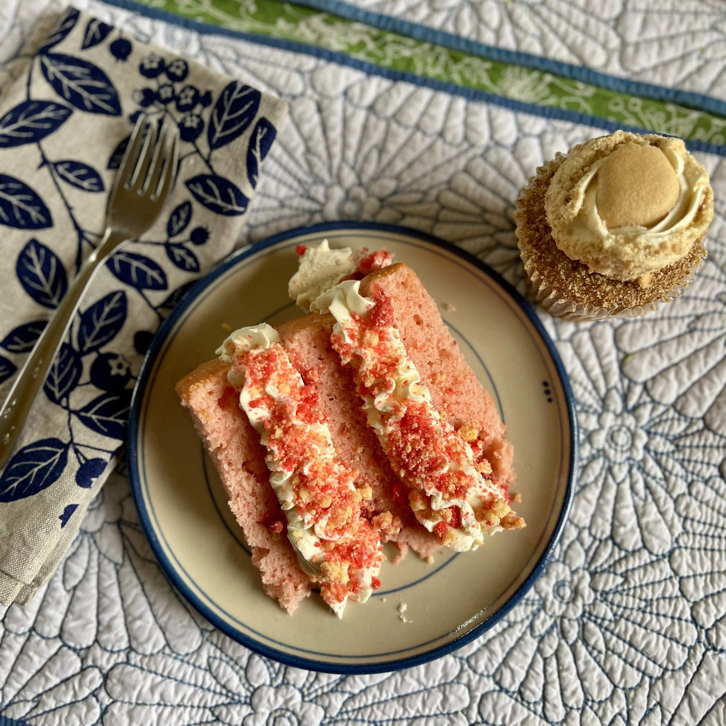 A slice of Strawberry Crunch cake and a Banana Pudding cupcake.