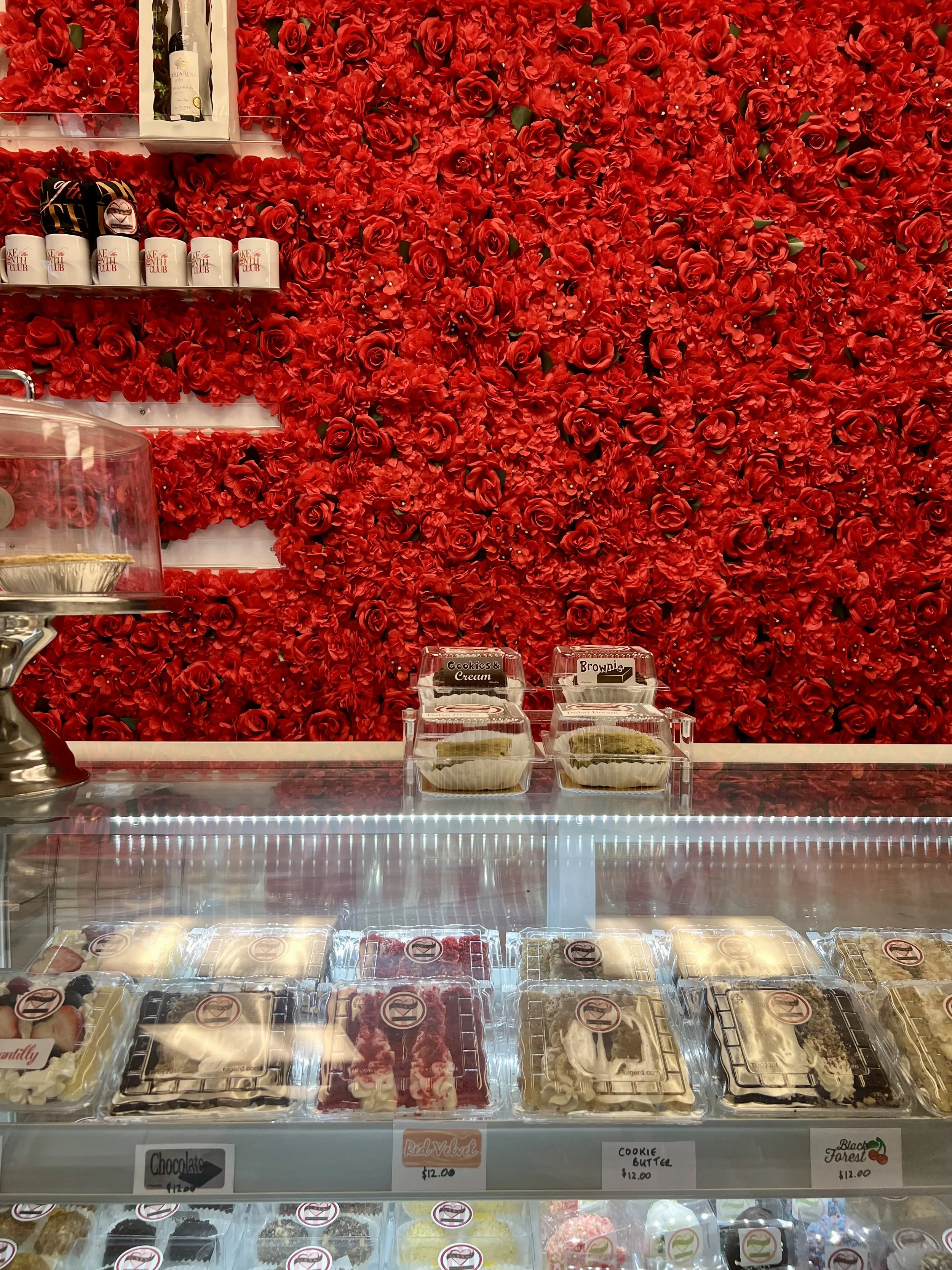 Just a glimpse of the bakery counter and a full wall of red roses at Love by the Slice.
