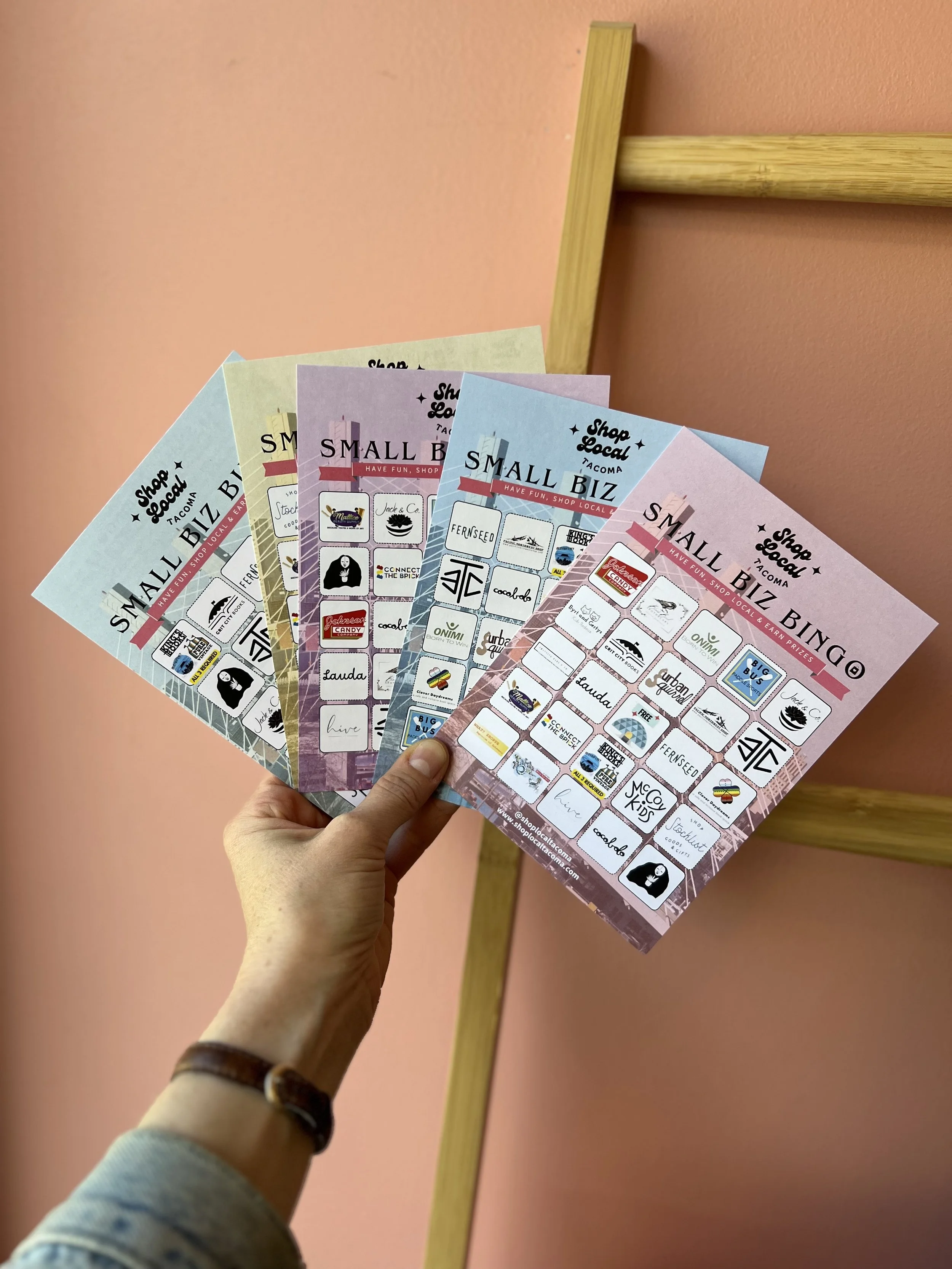 Prizes! Small prizes for completing a row of 5. Big prizes for filling your entire bingo board! Reference all the guidelines for how to play at Shop Local Tacoma.